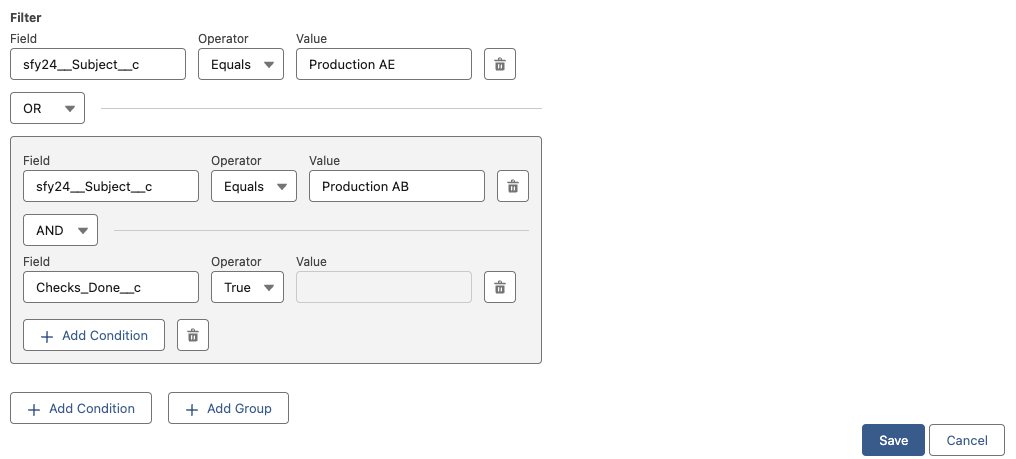 In the Team Cockpit Settings page, apply filter logic in order to show only your relevant orders. Create your own filter logic by adding conditions and/or group them.