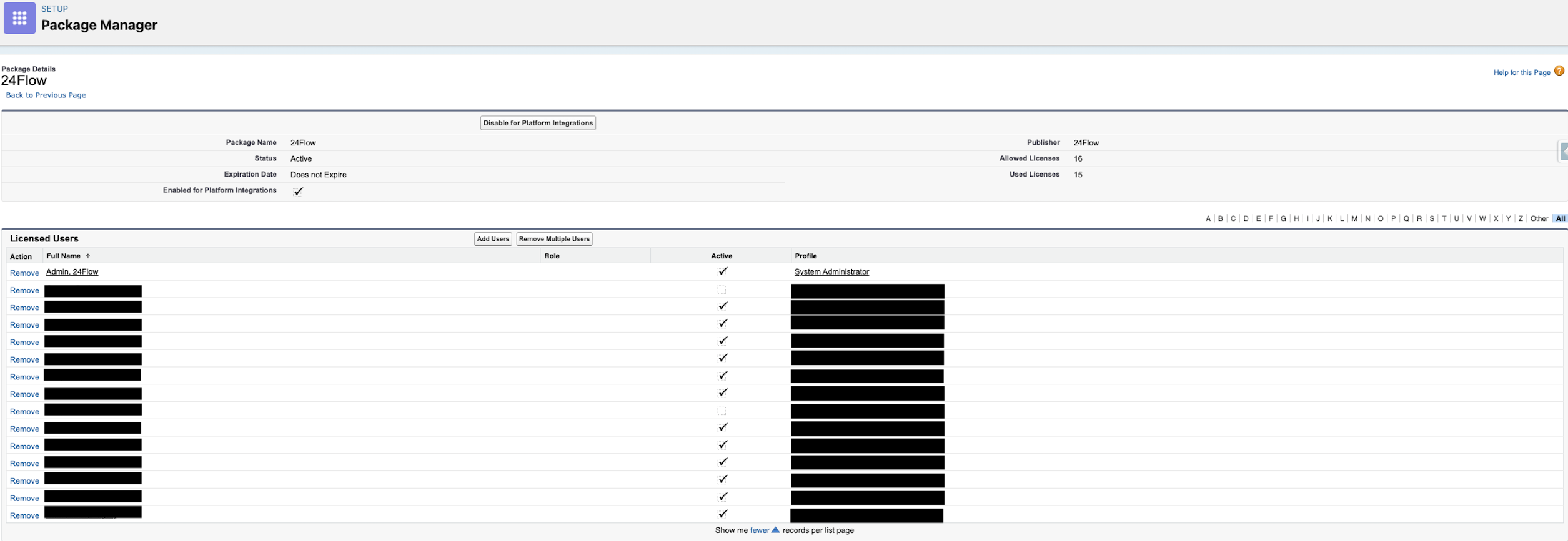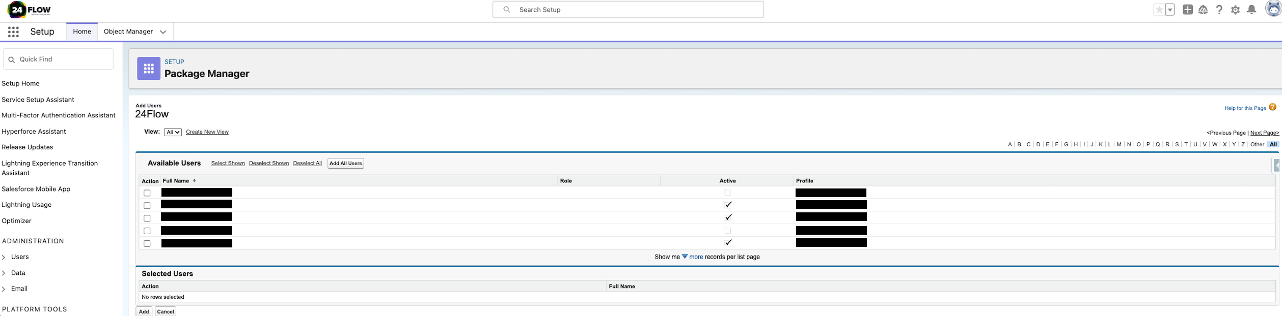 To get an overview of the 24Flow user licenses that are not yet assigned to a user, go to Setup and search for Installed Packages. In the overview of the installed packages, click on “Manage Licenses” for package 24Flow.