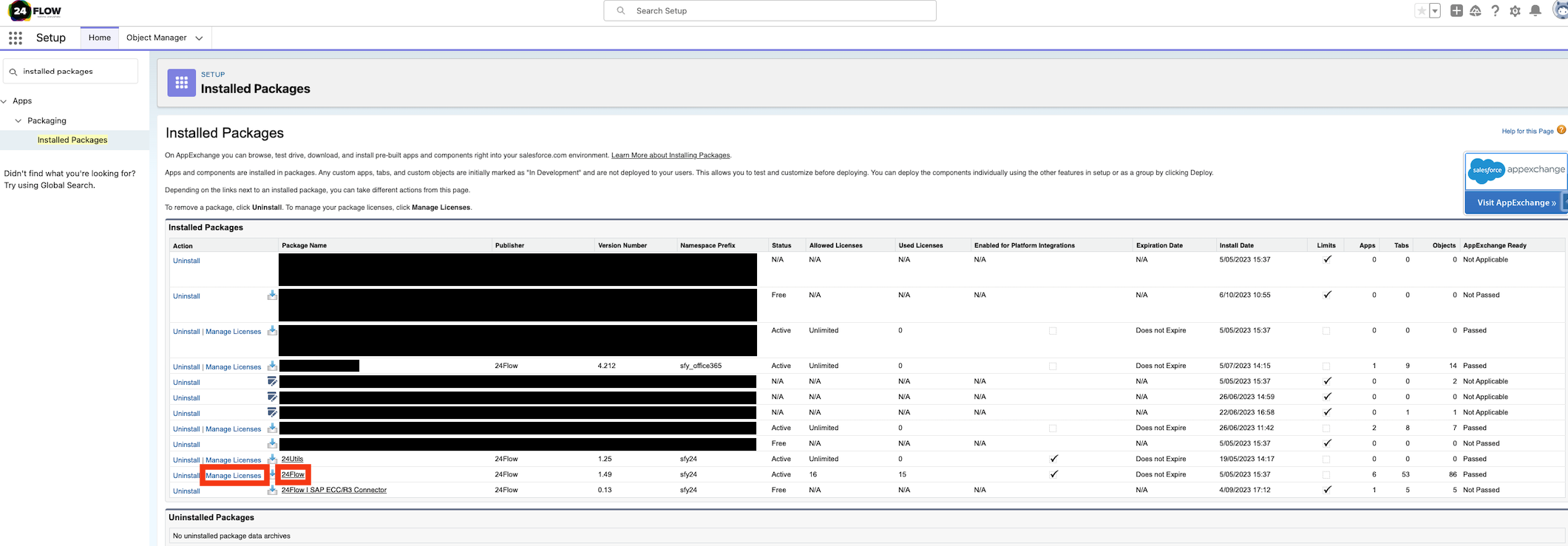 Overview of all installed packages. To manage the 24Flow licenses, click on “Manage Licenses” for package “24Flow”.
