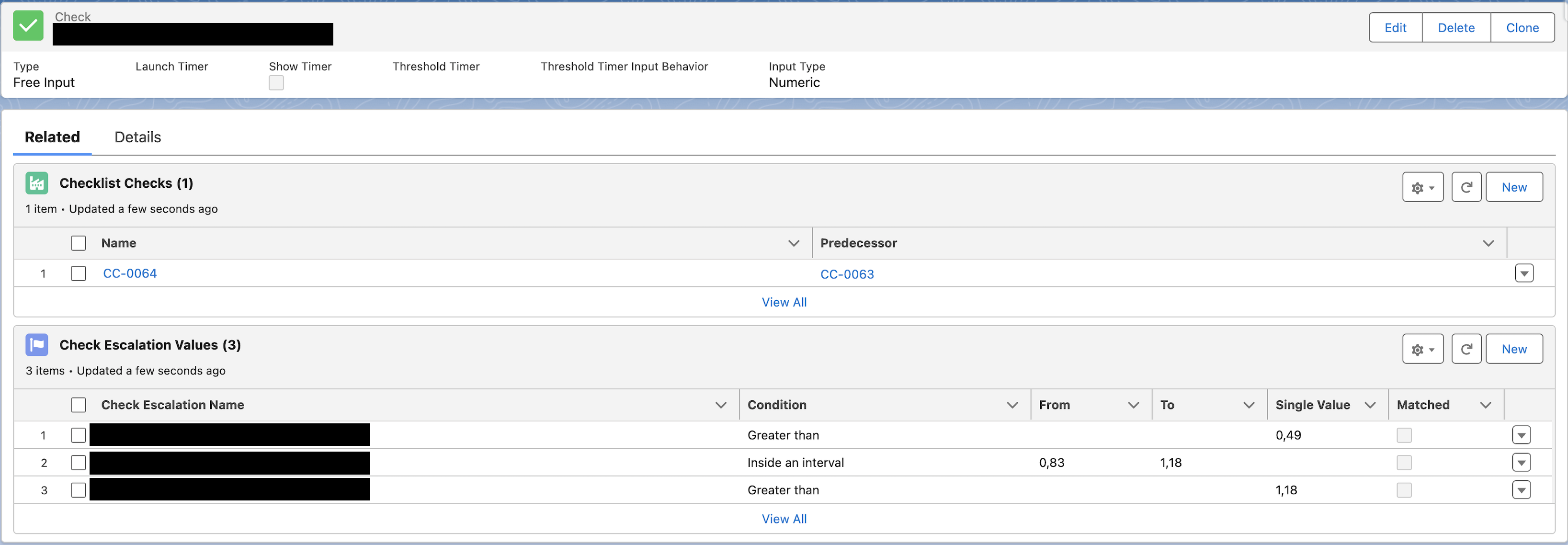 Go to the Checks tab, select the relevant Check for which you want to create Check Escalation Values and go to the section “Related” and click on “New” for “Check Escalation Values”.
