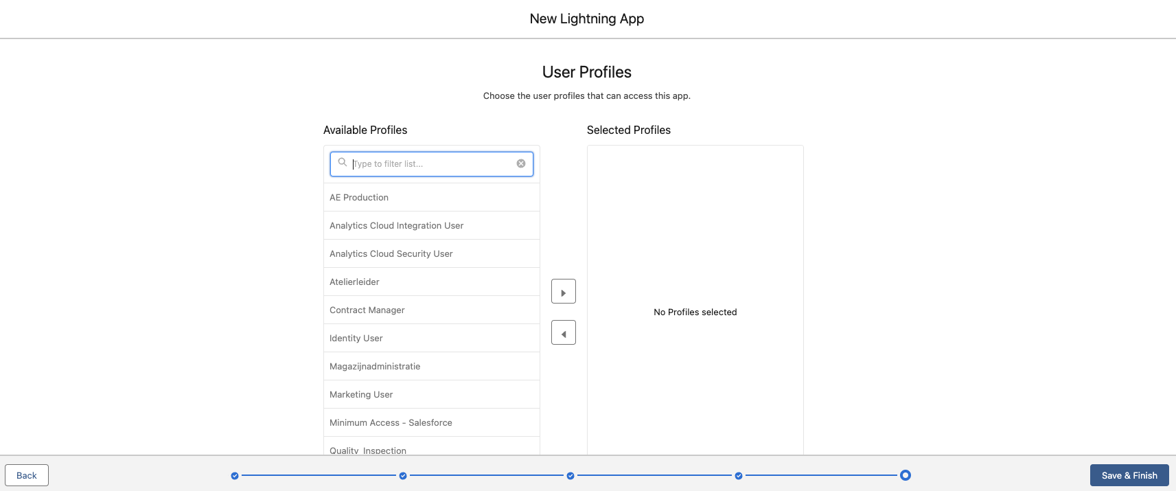An overview of all existing apps in your org. Click on “New Lightning App” or edit an existing app.