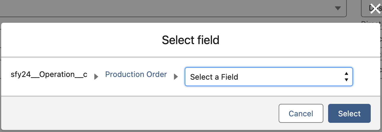 Choose your field on the higher object. In this case, Production Order.