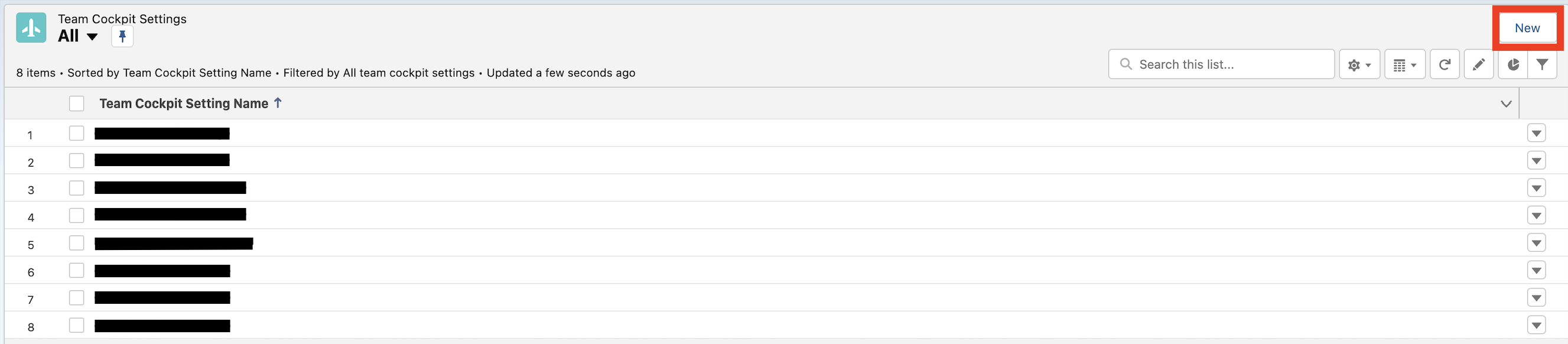 An overview of all Team Cockpits Settings records. On the top right click on “New” to create a new settings record.