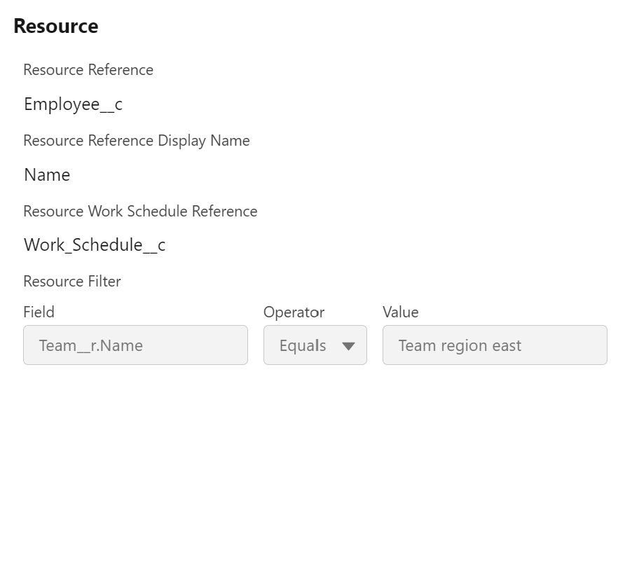 The work schedule is linked to the datasource resource. Fill in the lookup relationship field in Resource Work Schedule Reference in the datasource configuration. In the example below, we configured the Work Schedule reference in the datasource configuration.