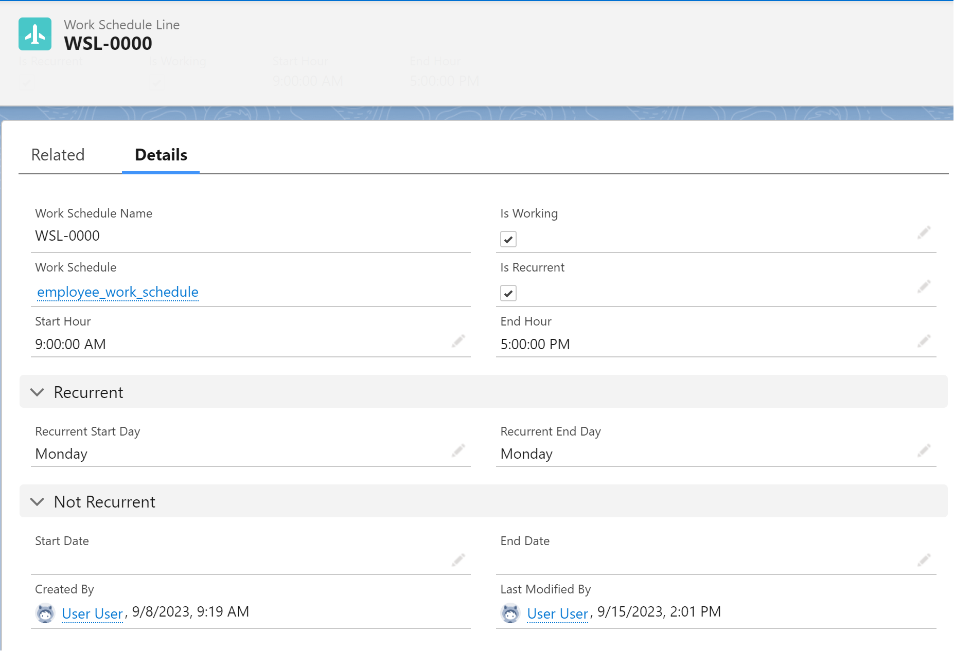 Is Recurrent: Enabled: the work schedule line is recurrent.