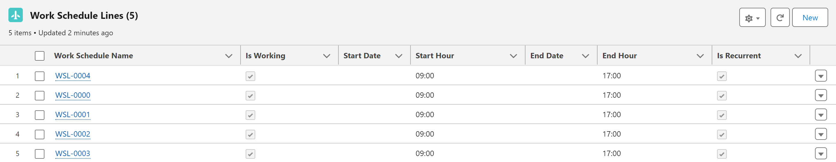 As an example: if you have a 5-day work week with working hours 09.00 am - 5.00 pm, Monday to Friday, you can define 5 Work Schedule Lines, as in the screenshot below: